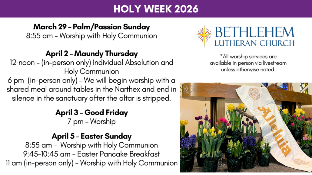 When we teach Confirmation at Bethlehem, we devote an entire class to the Biblical stories that shape Holy Week because they tell the story of Christ’s self-empyting love. While the scenes of betrayal, denial, imprisonment, trial, and wrongful conviction that shape this week may or may not be part of your life experiences, they are human experiences that Jesus lived. And they are the experiences of many in our world today.