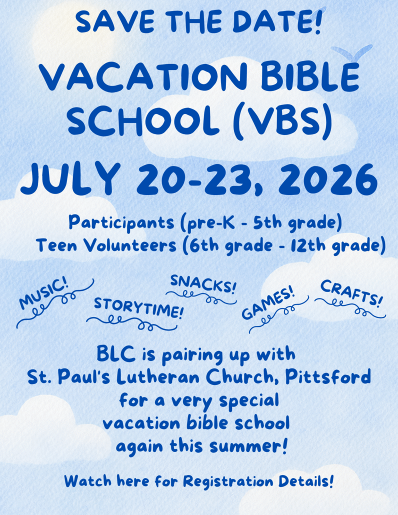 BLC will host VBS in Fairport in partnership with St. Paul’s Lutheran, Pittsford. Volunteers (6th grade and up) will be needed for the week, a day, an hour, whatever you have to give! Contact Patty Chaffee if you can volunteer in some capacity. Friends, grandkids, and neighbors are welcome and encouraged to participate! Help us spread the word by inviting others!